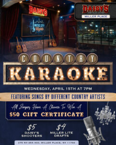 Join us for Country Karaoke Night at Daisy’s Miller Place, where you can sing your favorite country hits and take your shot at winning big.